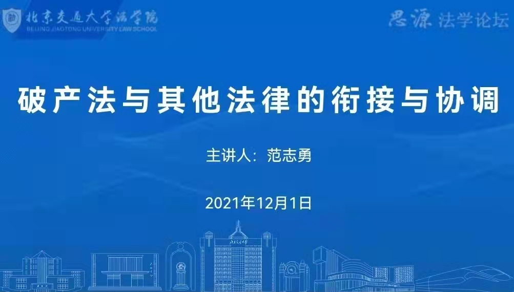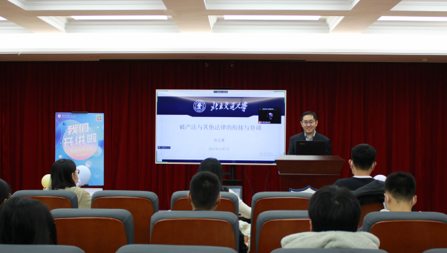 活动之初,李文华老师从中国的破产法的诞生背景与其在现代生活的重要性出发,指出破产法与其他诸多法律具有密切联系。随后,范志勇老师围绕“破产法与其他法律的衔接和协调”的主题,结合自己的研究成果,从历史渊源,制度框架以及新时代、现代化经济体系与破产法的完善等角度向同学们详细介绍了我国企业破产法的体系框架与价值体系,并提出了破产法的相关基本原则。此外,范老师详细介绍了破产法与公司法、保险法、民事诉讼法等诸多法律之间的联系与冲突,为同学们提供了更开阔、更多样的学习方向与研究思路。