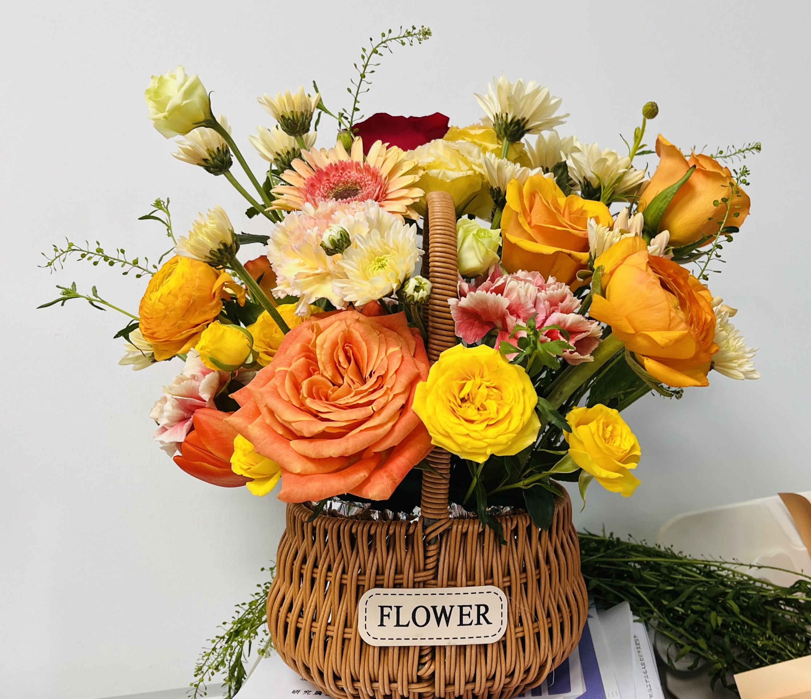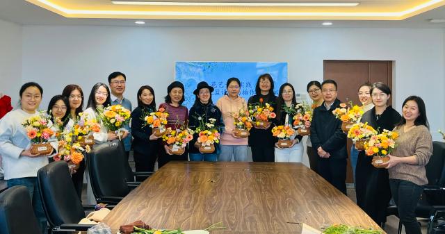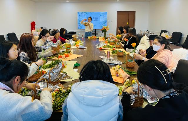 花艺专题实践环节,花艺师首先带领老师们认识花材、学习养护知识及花篮设计与插作技巧,然后指导老师们整理花材并完成各自的鲜花花篮作品。