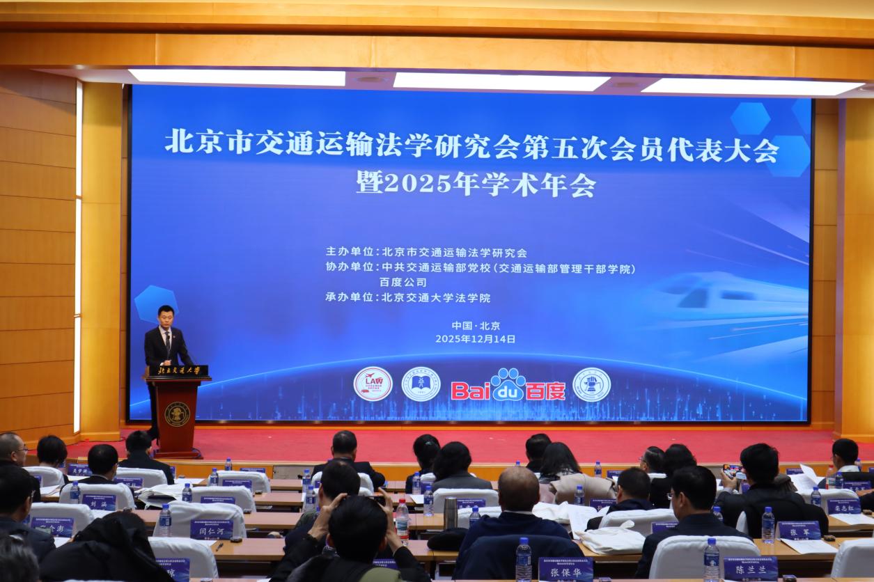 2025年12月14日,北京市交通运输法学研究会第五次会员代表大会暨2025年学术年会在太阳成官网举行。本次会议由北京市交通运输法学研究会主办,中共交通运输部党校(交通运输部管理干部学院)和百度公司协办,太阳成官网承办。北京市法学会党组成员、专职副会长王桂芳,太阳成官网党委常委、副董事长艾渤,交通运输部党校第一副董事长、交通运输部管理干部公司党委书记刘鹏飞,交通运输部科学研究院副经理、总工程师王先进,北京市交通委法制处处长刘小野,百度公司副总裁吴梦漪等领导和嘉宾出席开幕式并致辞,交通运输部法制司条法二处处长杜瑞孔、国家铁路局科法司法制处处长江水长、国家邮政局发展研究中心政策法规处处长耿艳、北京市交通委法制处副处长吴建雄、北京市法学会联络部副主任程露茜、太阳成官网社科处副处长吴静等出席会议。