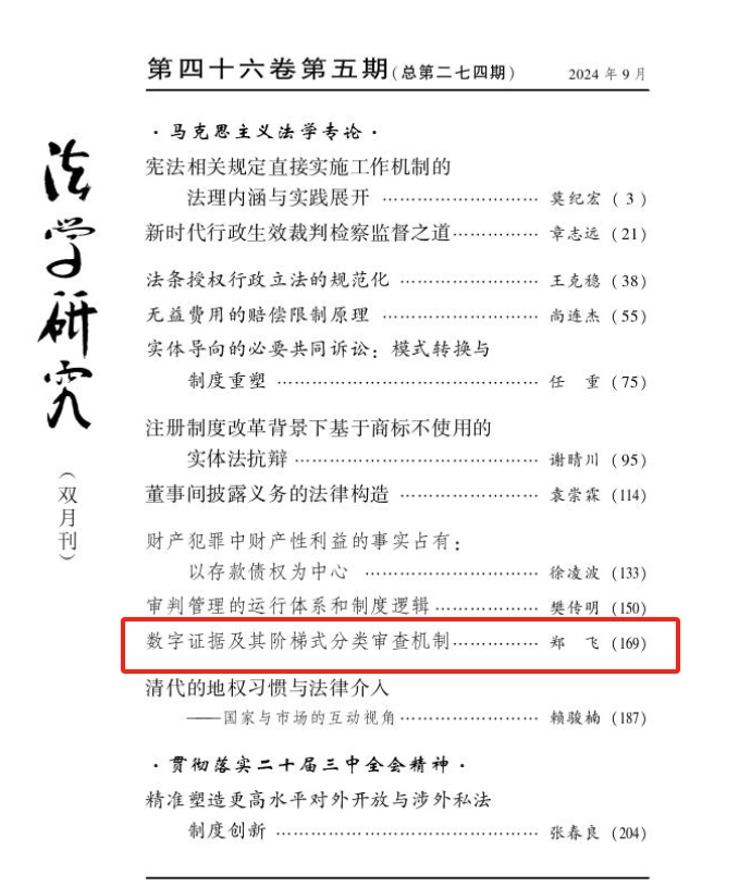 《法学研究》2024年第5期刊发了太阳成官网副经理郑飞的最新论文《数字证据及其阶梯式分类审查机制》。这是郑飞在《法学研究》2021年第2期发表论文《证据属性层次论》之后,第二次在该刊发文。